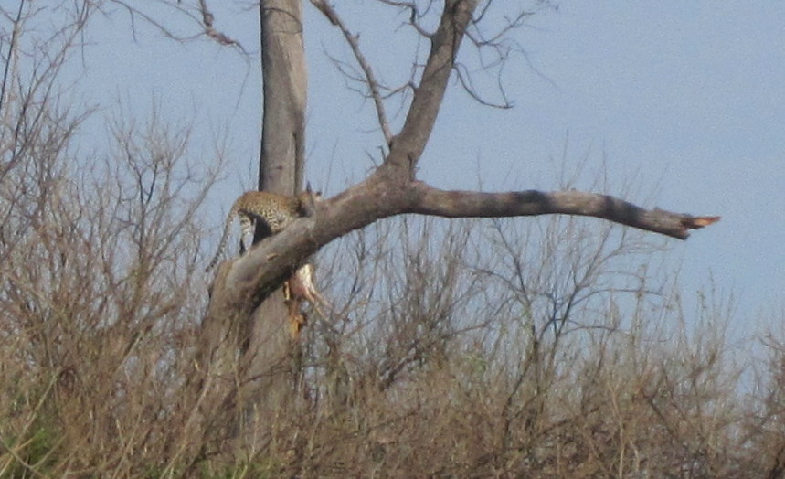 - The leopard sitting 30 feet up in the tree with a (pretty much) whole impala balanced there. Lunch for the week.
