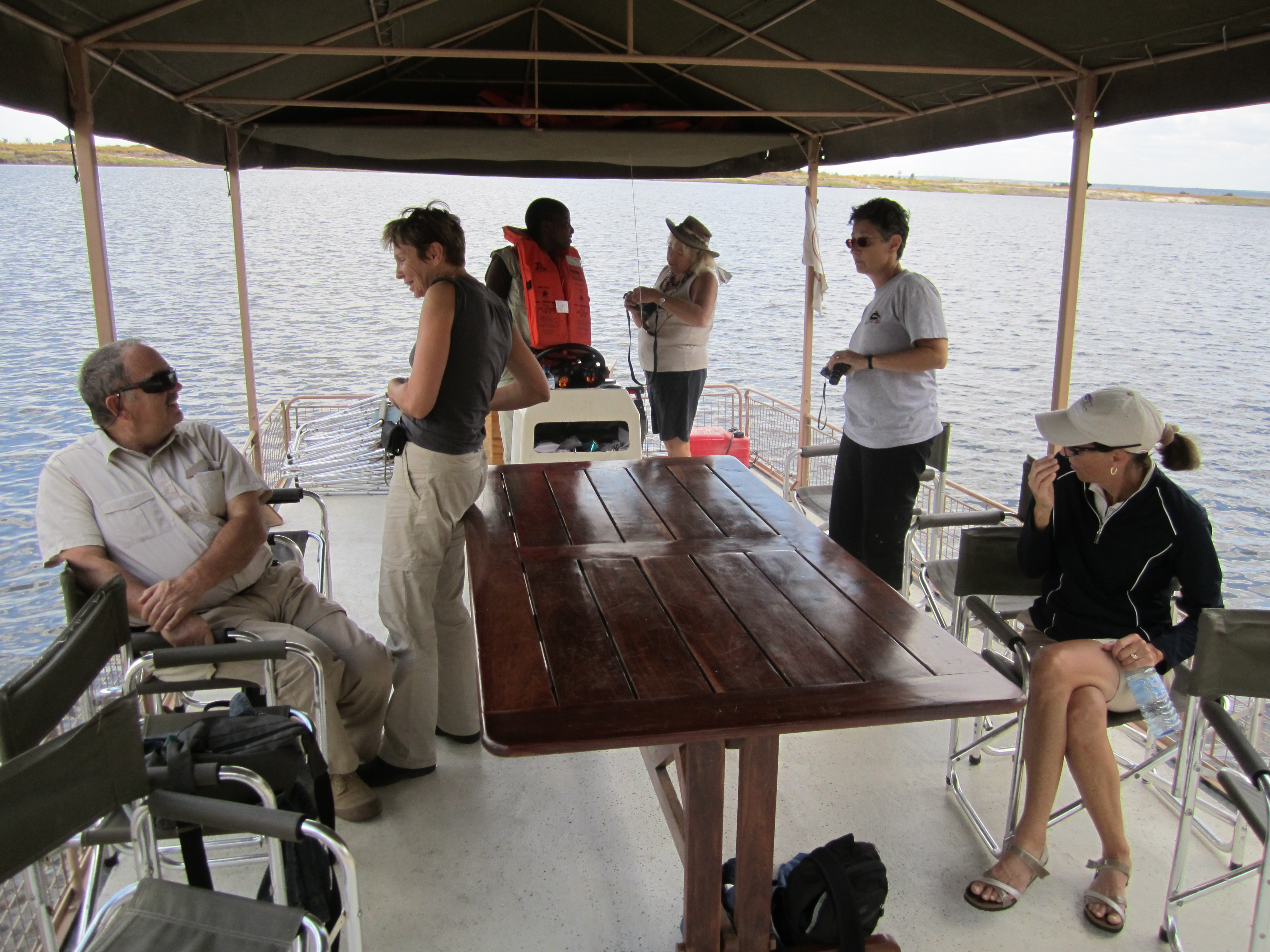 A half dozen of us gathered at the dock for the boat trip. Lettie, our guide was at the helm (is the helm at the front or the back?). Off we go down the Chobe River. The Chobe flows into the Zambezi River and divides the country of Botswana from that of Namibia (see geography lesson in next post.) A couple of hours of pleasant cruising, observing and learning and we were back for lunch on the deck. Lunch ended with a floor show (ground show) of a dozen dancer/singer/chanters re-enacting some rituals of long ago native Botswanians. All great fun. Then a bit of down time before our next game drive at 4:00.
