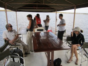 As promised, I’m not going to go over every animal we saw, how many of them and so on. Suffice to say they were excellent and rewarding and educational. Not only did we drive and observe but the guides were very knowledgeable and gave us incredible amounts of information about the animals, birds and plant life most of which I forgot almost immediately. I’ll simply focus on the half dozen particularly outstanding experiences as they come up. We ended up this game drive around 9:00 and headed back to the camp for an excellent breakfast on the deck. Then a few minutes rest since we have to get ready for our first river cruise where we’ll see the park and its animals from a different perspective.