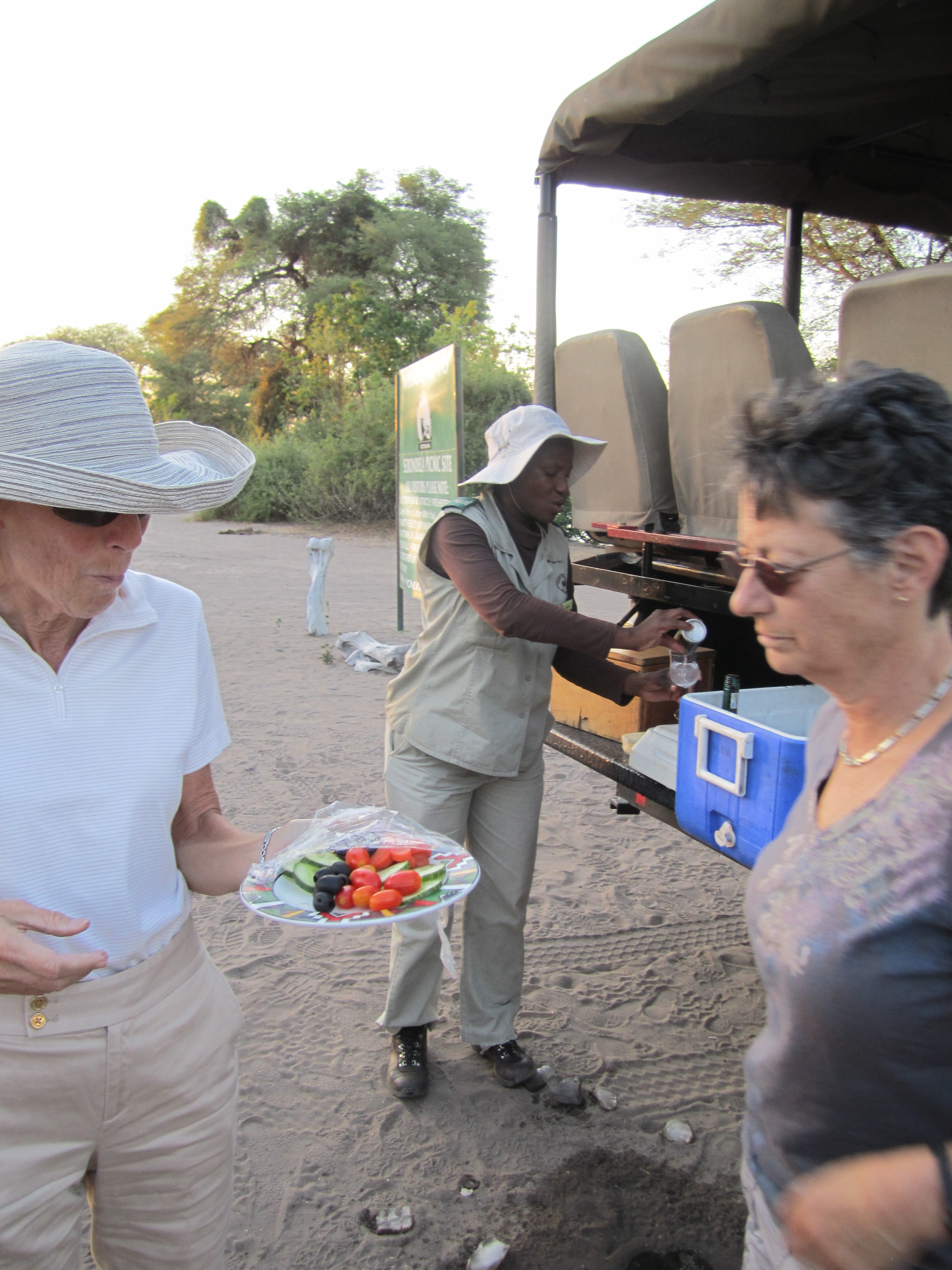 I thought standing in the dark waiting to be eaten by a lion was scary. I know that elephants can be ferocious if threatened. And crocodiles; well we all remember Captain Hook. I thought I was prepared for all the scary things Africa held for me. But I wasn’t prepared for a Claire at 5:00 AM. You’d think it would be difficult to use the words comatose and dangerous to describe the same person. However, we managed to get through it. Although she tried the old “you go ahead, I’ll be right there” gambit I pushed and prodded until we arrived in the lobby to join the others. There we found fresh coffee and juice and some light breakfast items and about 20 surprisingly enthusiastic safariers. At 5:30 we climbed aboard the vehicles and off we went.