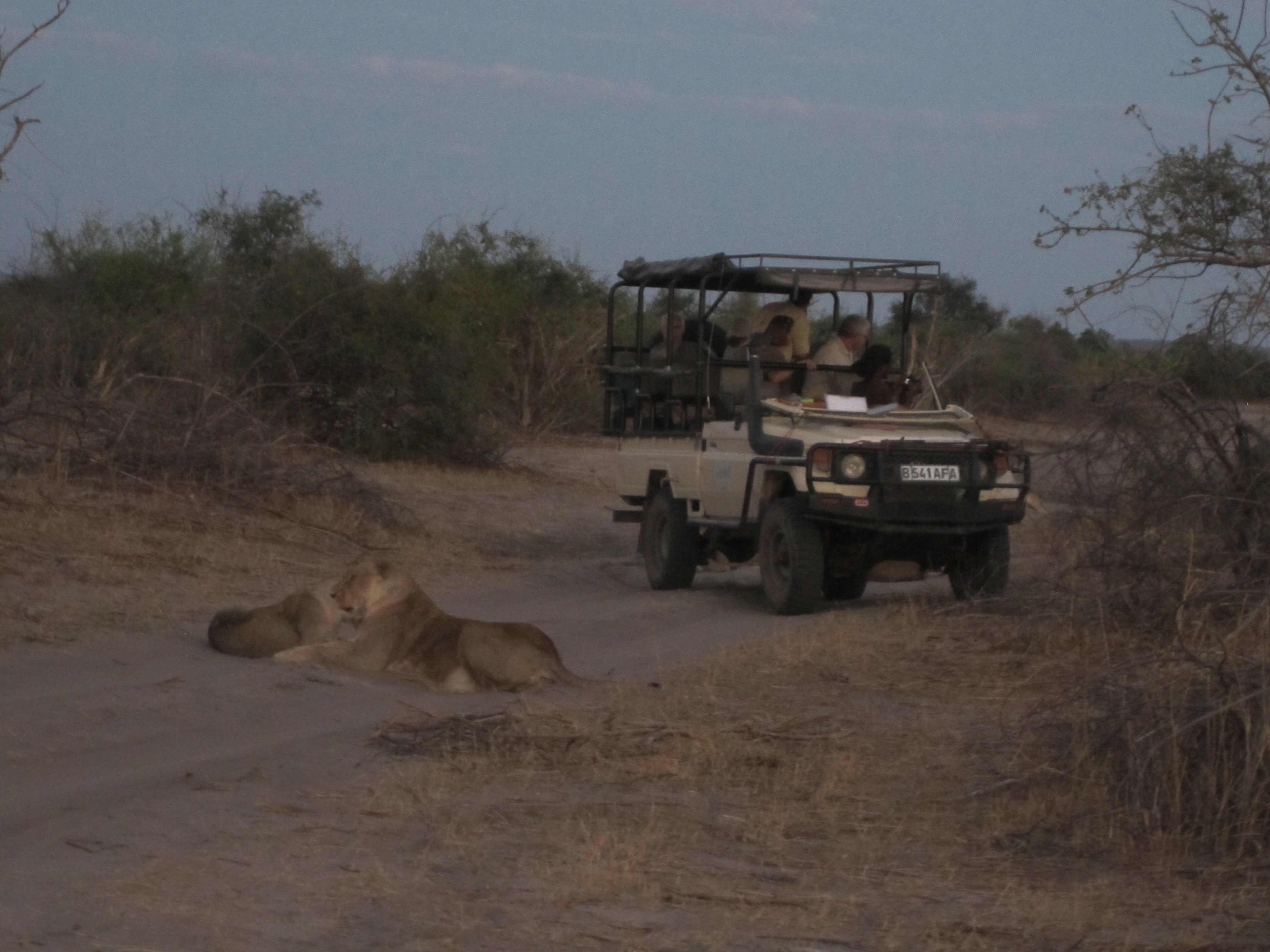 Our second afternoon game drive of our trip followed the familiar pattern (less the flat tire) and a good time was had by all. However, (and there always seems to be a however) after our sundowner, on our way back to the camp we ran into a small traffic problem. Lying in the middle of the road was a lion. We came to a halt to watch it for a few minutes as had another vehicle on the other side. We were thinking this was kind of neat. Lettie was thinking “how do I get around this lion so we can get back before dark”. She moved the vehicle a little closer to try and get it to move. It did and walked beside us to lie on the road behind us. Good then now we could go. Except now we see that there wasn’t just the one; there were 5 more lying on the road a little further down, none of them showing any intention of going anywhere. You’ll have to appreciate that the closest of these was perhaps 15 feet away from us. After two or three manoeuvres, Lettie concluded that she couldn’t get around. Cognizant that lions start getting a little peckish when the sun goes down, she opted to back-track to try to find an alternate but much longer route back. All turned out OK but for the second day in a row we arrive back in camp in the pitch black. I think Lettie’s next performance appraisal might have a little something to say about punctuality.